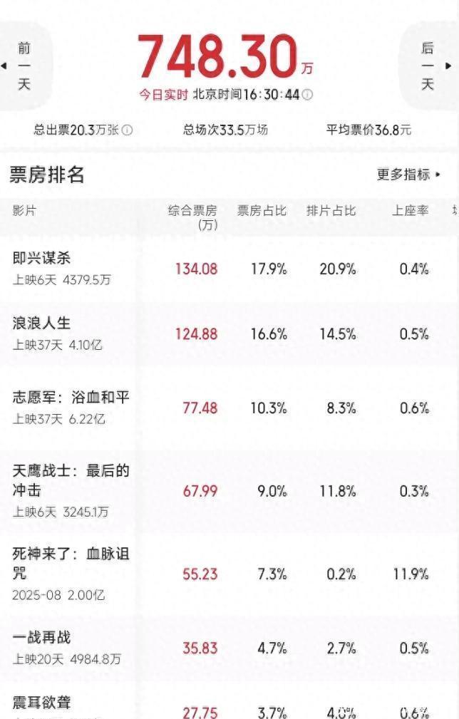 4天仅卖111万,《旁观者》票房扑街,这张“金字招牌”算是砸了 截止到现在,今天电影市场的单日总票房才 748 万,刚有点回暖的迹象又凉下去了。 看刚出来的票房榜,表现最好的《浪浪人生》和《即兴谋杀》,票房也就在 120 万到 135 万之间晃悠。剩下几十部在映的片子,居然没一部能破百万,这天气转冷,市场是真进入寒冬了啊。 李庚希、邓家佳演的《即兴谋杀》,走女性题材还带点恐怖元素,挺贴合万圣节的。虽说评分才 5.1 分,但票房已经超 4300 万,预测能冲到 7800 多万,算近期里能打的了。